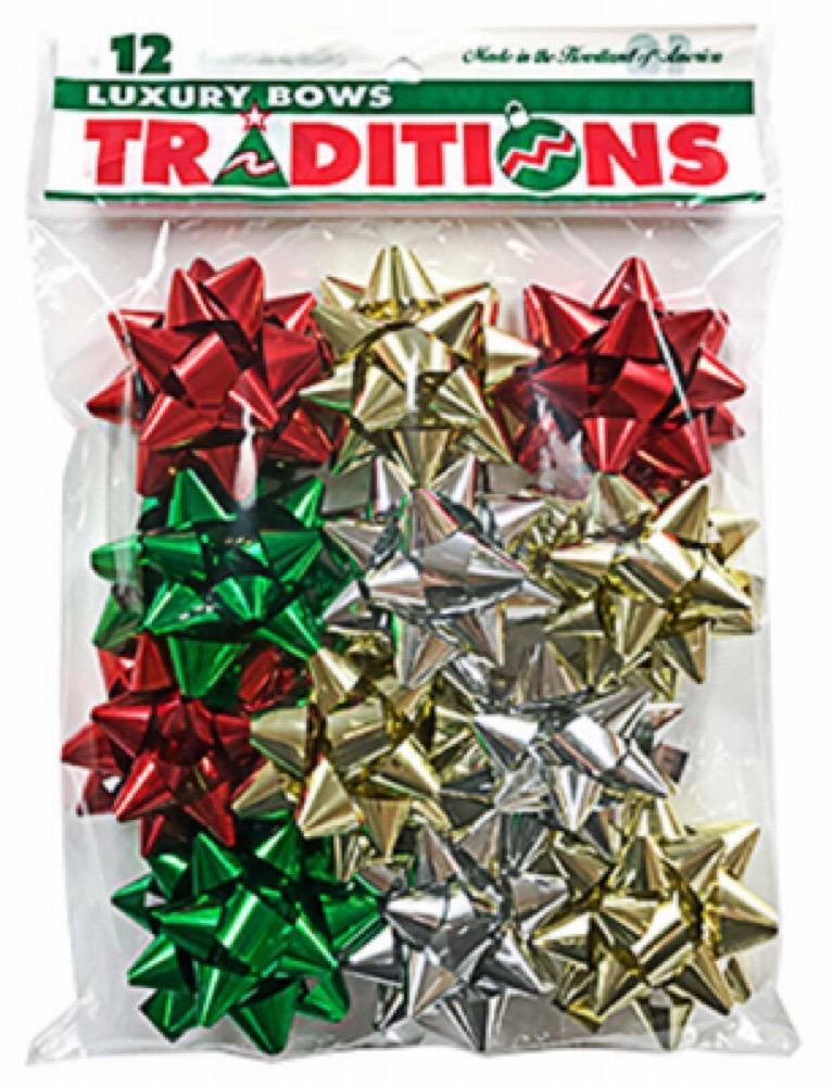 12 Count, 4", Metallic Bow, Assorted Colors, Green, White, Red, Silver & Gold.