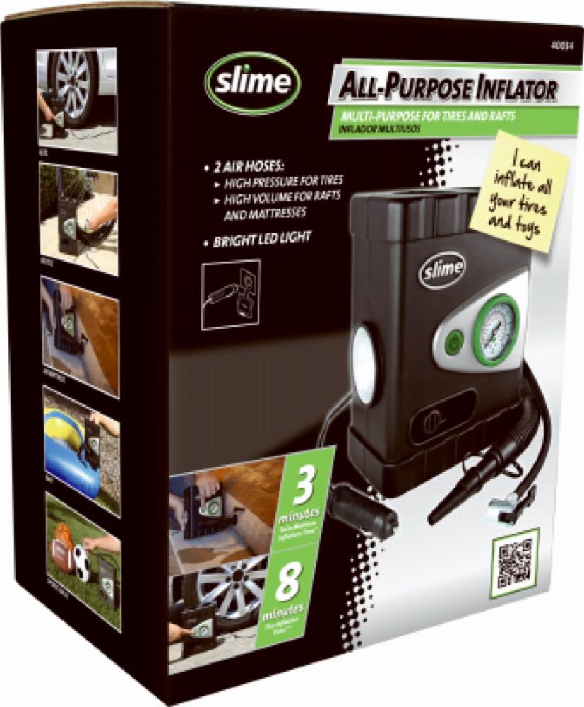 Slime, 12V, All Purpose Tire Inflator, 12V Power Connection With 15A Fuse, On/Off Switch, Built In 0-100 PSI Dial Gauge, 16.5 cm Raft Air Hose: 65 cm Quick Connect Air Hose, LED Light, Accessory Kit Includes Ball Needle & Black Adaptor, 0.58 High Pressure CFM, 0.42 High Volume CFM, 10 Power Cord Length, 8 Minute Inflation Time For Standard Tires, 3 Minute For Mattresses, Has 2 Types Of Air Hoses That Allow It To Air Up Anything From Car Tires To Balls & Even Mattresses, For Camping, You Can Use Its Bright LED Light To Help You Air Up Your Mattress At Night, On/Off Switch & Built In Dial Gauge.