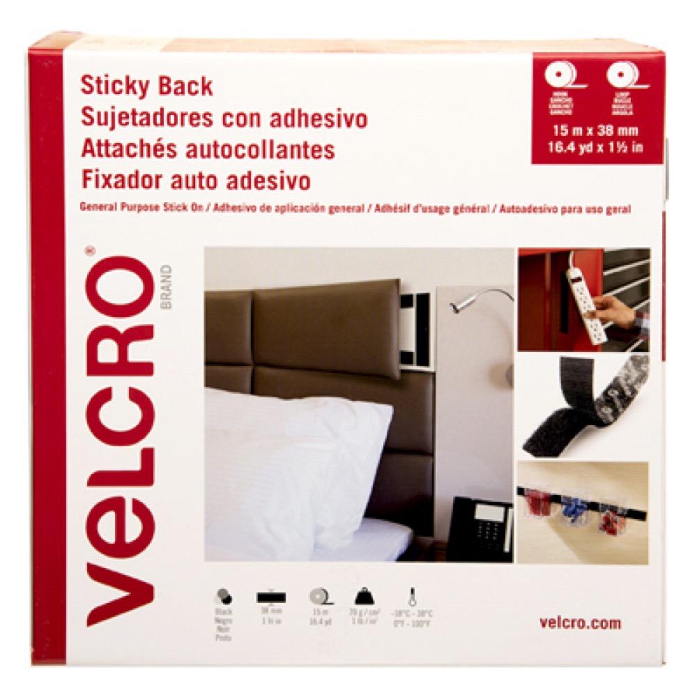 1.5" x 16.4 YD, 15m x 38 mm, Black, Velcro Brand Sticky Back, General Purpose Tape, Holds LB/IN, 0-100 Degrees, Bulk.