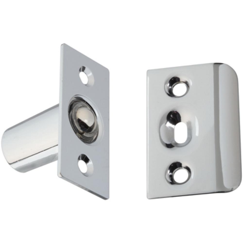 V716, 1" x 2-1/8", Chrome, Ball Catch, Used On French Doors, Single Doors & Cabinets, Adjustable Ball For Door Gap & Latching Tension, Replaces Existing Door Bolt & Strike, Screw Holes Are Countersunk For Flush Mount, Replaces Existing Door Bolt & Strike, Manufactured From Steel, Carded.