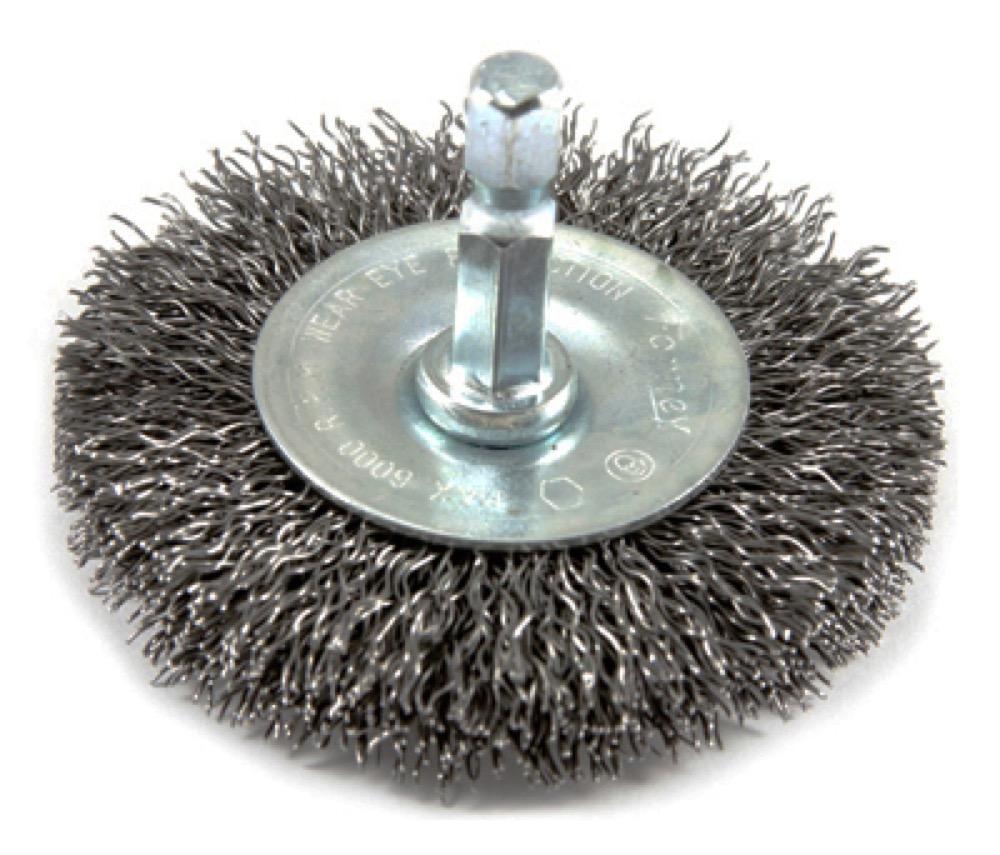 2-1/2" x 1/4" x.012", Crimped Wire Wheel, Stem Mounted, Coarse, 1/4" Hex Shank, .012" Wire Size, Designed For Easy Access Into Narrow Holes & Confined Areas, Crimped Style For Light To Medium Duty Applications, Removes Rust, Scale & Paint In Hard To Reach Areas, Use With Any 1/4" Diameter Electric Power Drills Or Pneumatic Drill.